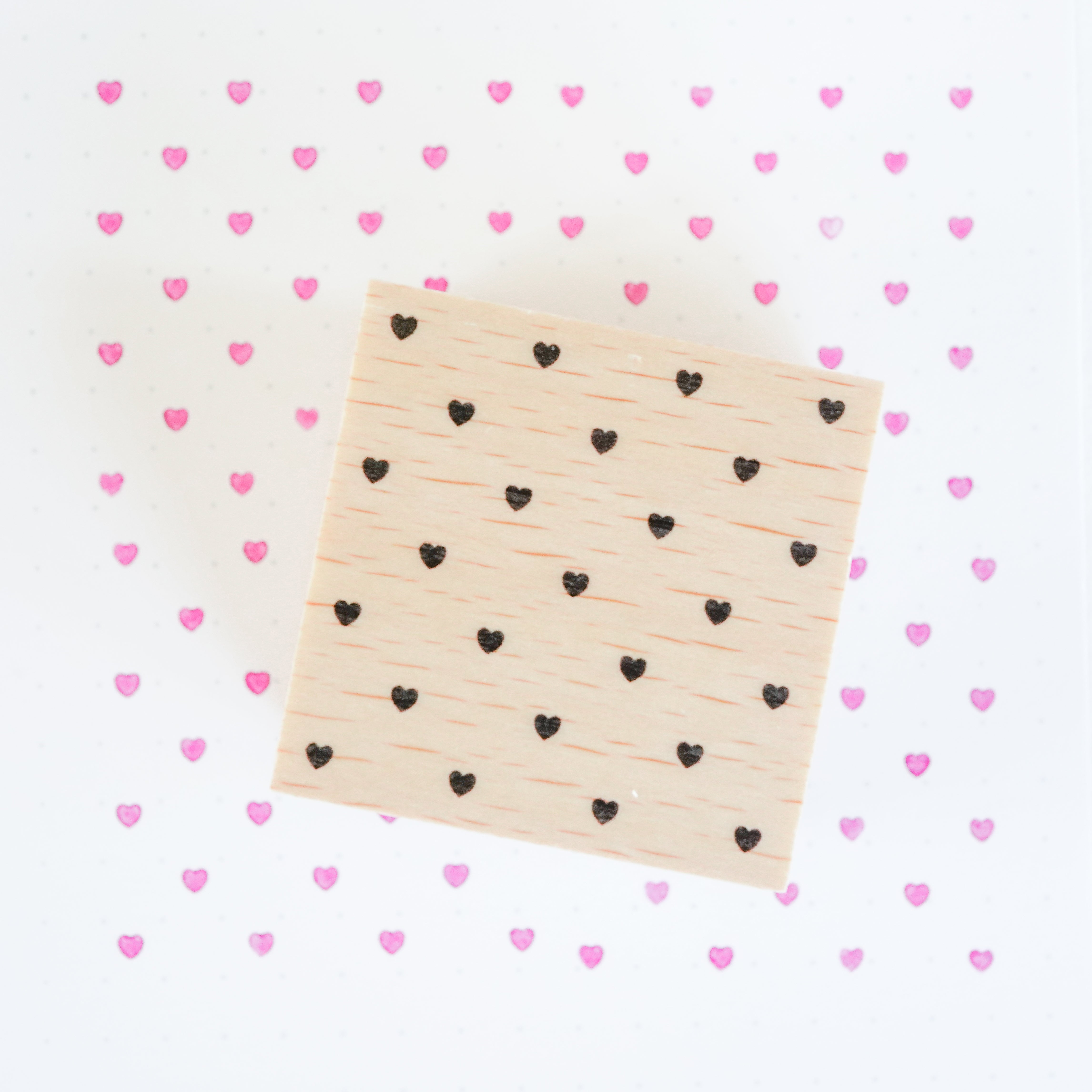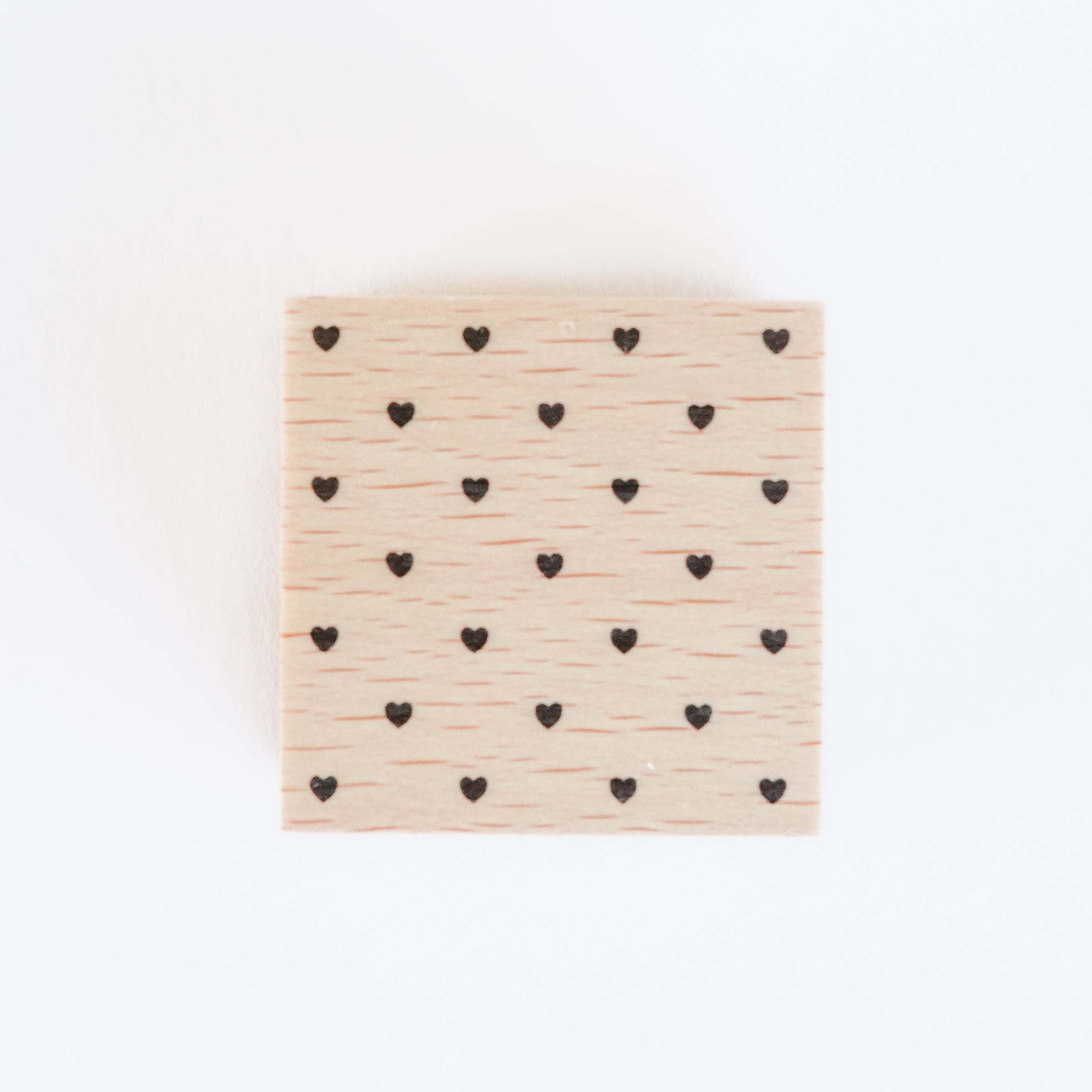 This charming stamp features a repeating pattern of tiny black hearts, evenly spaced across a smooth, natural wood block. The simple, playful design is perfect for creating backgrounds, borders, or accents on cards, packaging, journals, and handmade goods. Its delicate heart motif adds a sweet, cheerful touch to any project.