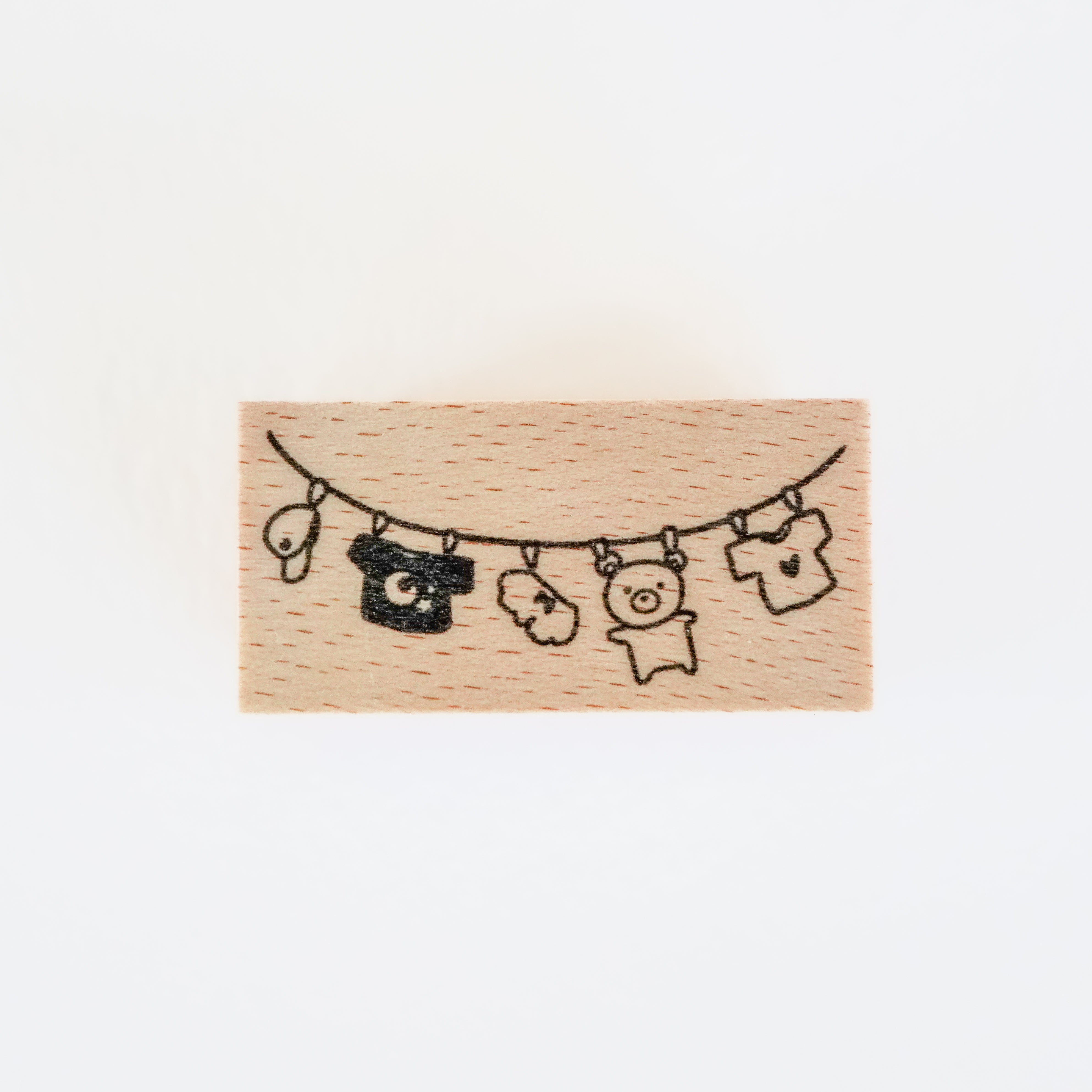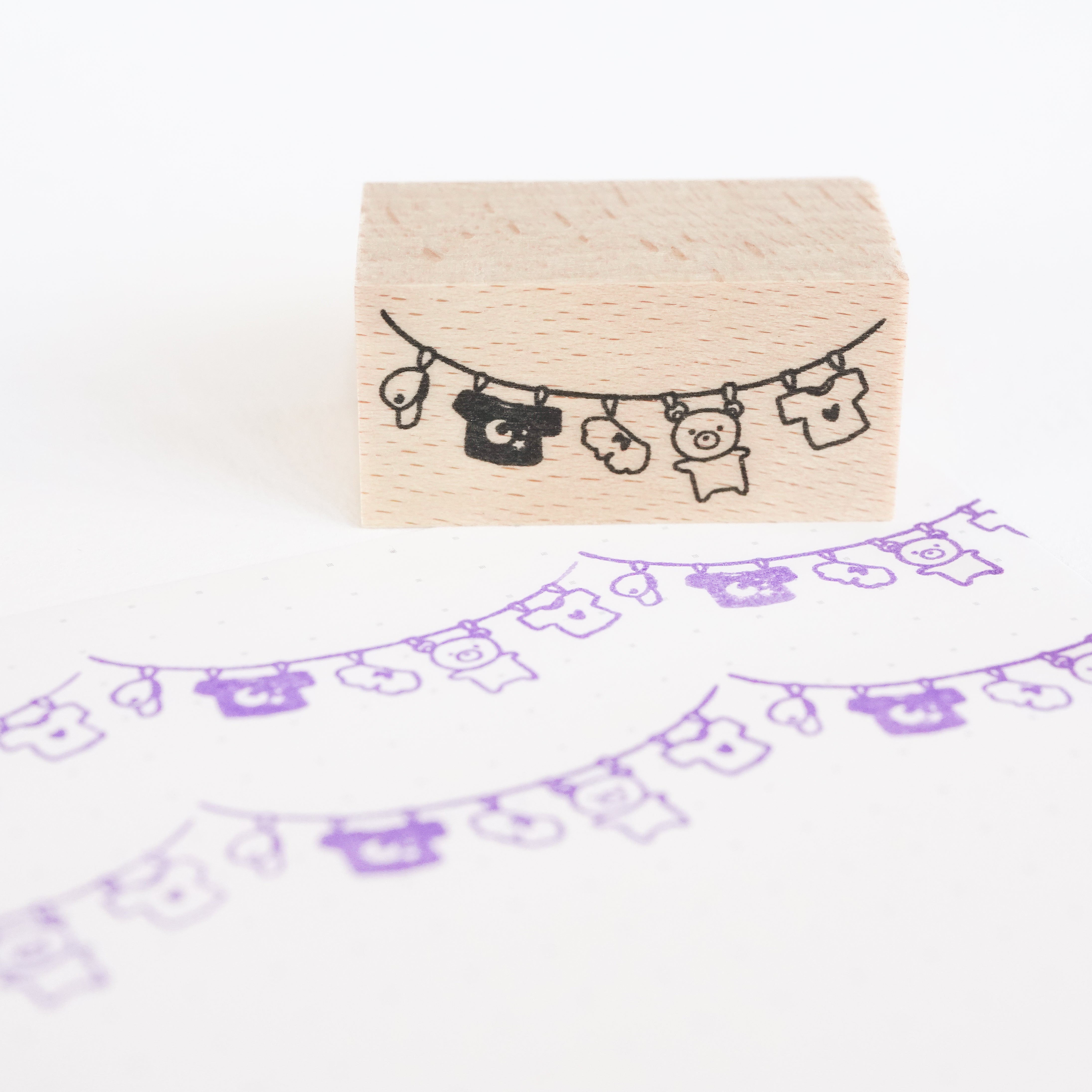A sweet wooden stamp depicting a baby bear doing laundry, expressing an everyday moment with gentle humor.
