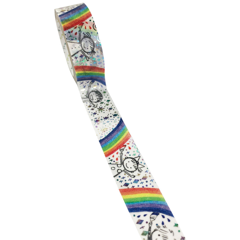 This decorative tape has rainbow foil stamping and color printing on thin paper.
